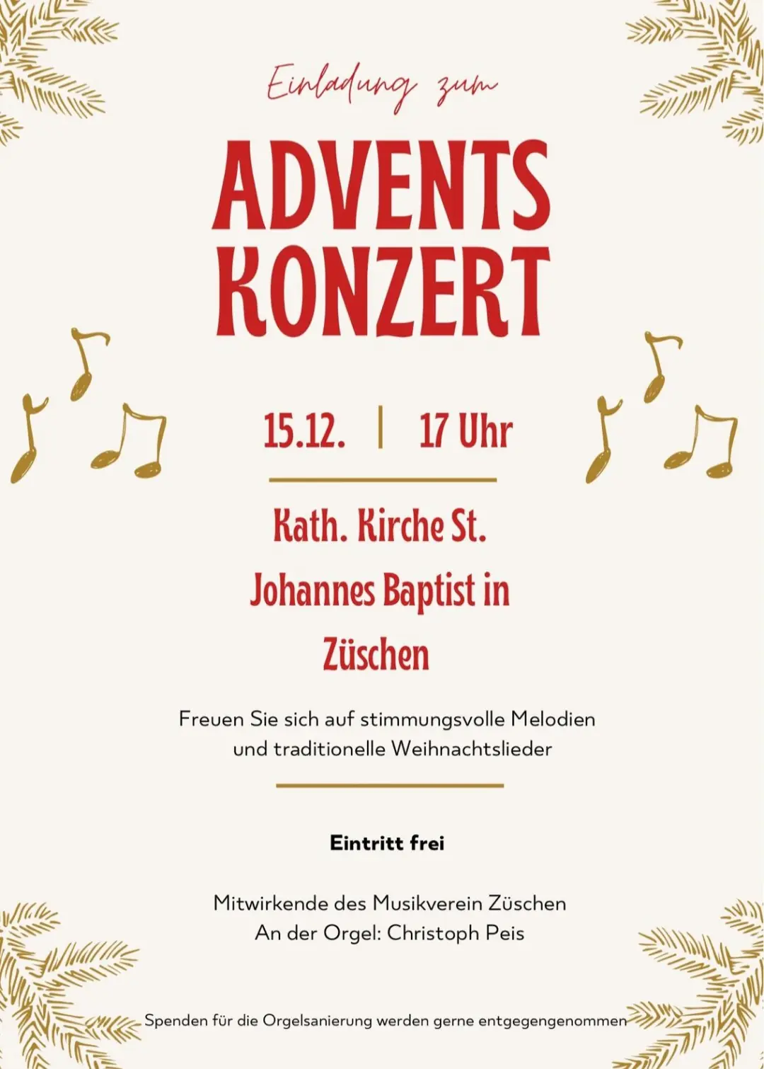 Der Musikverein Züschen 1910 lädt alle Züscher und alle Gäste am Sonntag, den 15.12.2024 um 17:00 Uhr zu einem Adventskonzert in der St. Johannes Baptist Kirche Züschen ein. Gespielt werden traditionelle Weihnachtslieder und der Eintritt ist frei.