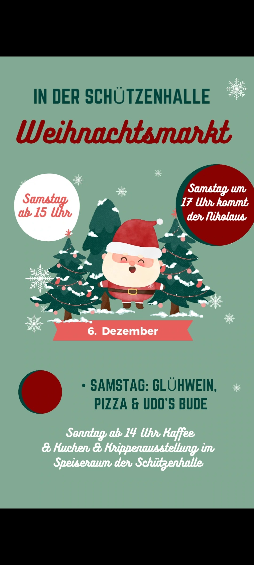 Am Sonntag öffnet um 14 Uhr die Cafeteria im Speiseraum der Schützenhalle, nochmals verbunden mit der Krippenausstellung. Das Singen von Weihnachtsliedern versetzt sicher alle Besucher am Sonntagnachmittag in Weihnachtsstimmung.