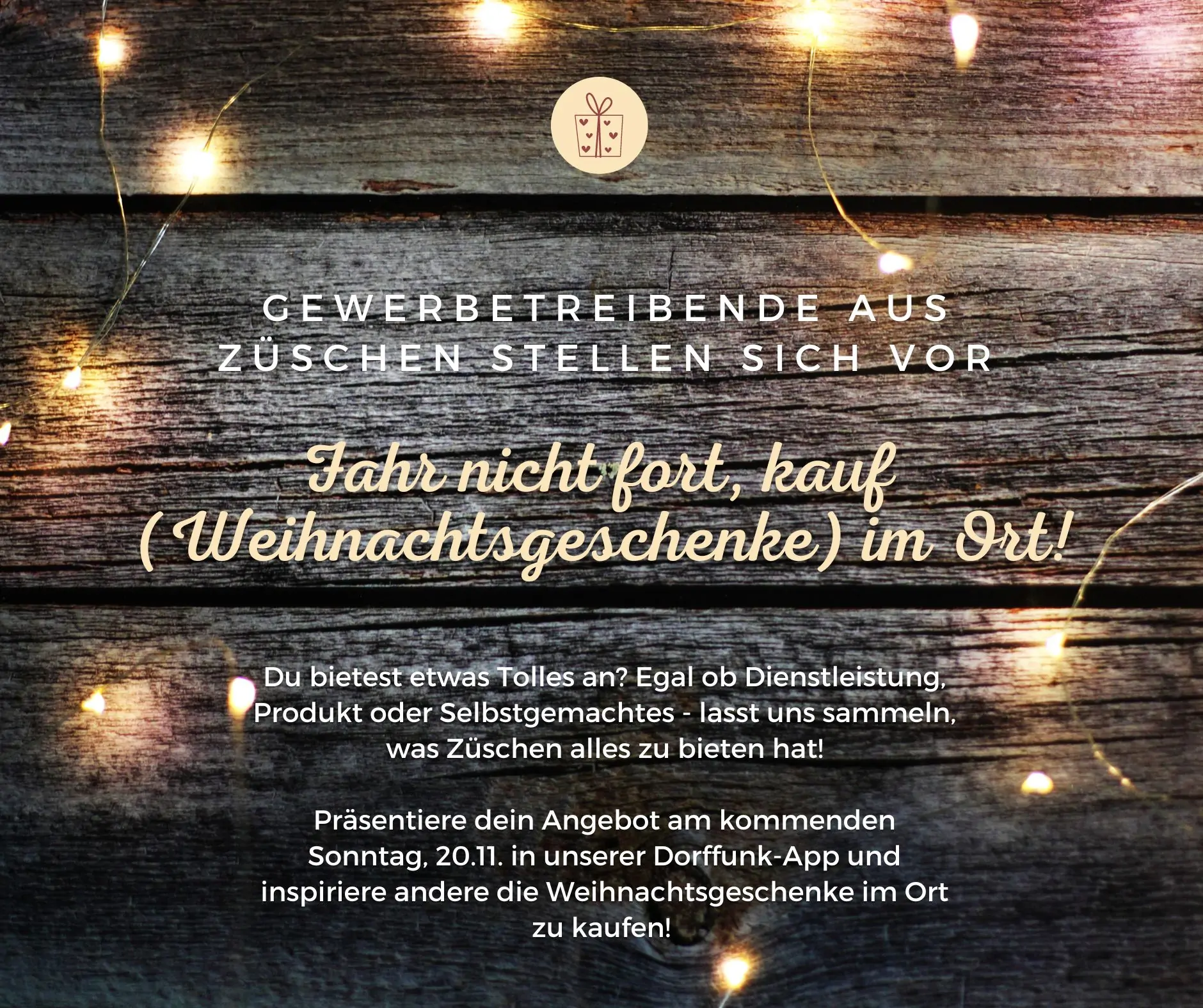 🎁 Dann schau doch am morgigen Sonntag hier in die DorfFunk-App unter der Rubrik „Biete“! Züschen hat einiges zu bieten, worüber sich andere unterm Weihnachtsbaum oder auch zu anderen Anlässen sehr freuen würden🎁 Egal ob ein Gutschein aus der Gastronomie, handgefertigte Kinderkleidung, Dekoratives oder Alpaka-Event… eine Sammlung an Inspiration! Fahr nicht fort, kauf im Ort! Teilen erwünscht ❣️